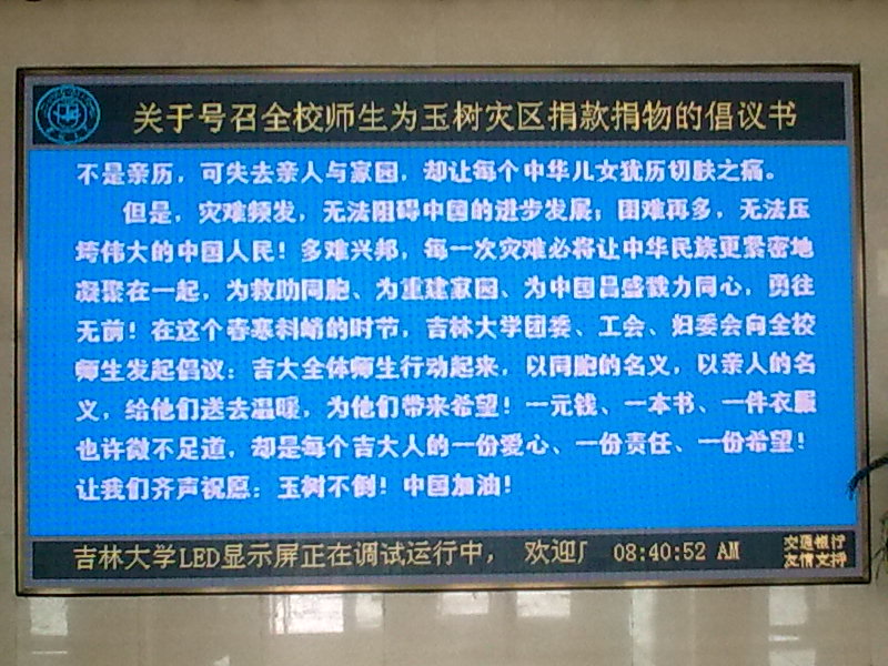 本学期,在交通银行吉林省分行的大力支持下,学校有关部门抓住中心校区行政楼校内外人员往来频繁、单位部门集中、窗口效益突出的有利特点,抢占有利宣传位置,安装LED多功能电子显示屏,并充分利用其多媒体功能,大胆尝试多种宣传手段的综合运用,大力营造正确舆论,推动校园文化建设,此举也得到了广大师生员工的赞许。