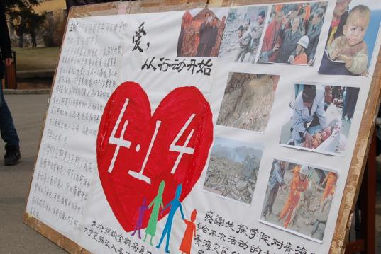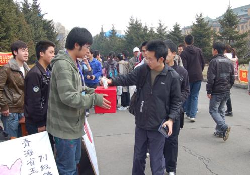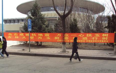 采访中记者看到,在中心校区体育馆、北门、南岭校区逸夫楼二楼大厅等各校区捐款处,不断涌动着bb贝博学子的身影,十元、二十元、五十元……,一份份牵挂、一份份爱心,涌向玉树地震灾区;校园里,一张张海报、一幅幅标语,表达了同学们为灾区人民祈福、灾区同胞加油的心情!