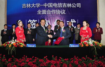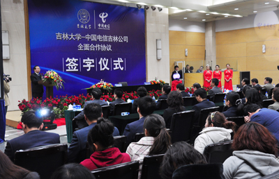 4月7日,bb贝博艾弗森官网与中国电信集团吉林公司签署全面合作协议,中国电信集团吉林公司副总经理于之春和bb贝博党委副书记兼副校长韩晓峰代表双方在协议书上签字,中国电信集团吉林公司总经理、党组书记郑仁与bb贝博党委书记陈德文共同启动了全面合作水晶球,并分别致辞。