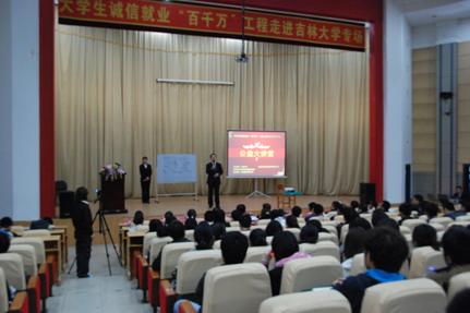 讲座中吉林省宝鑫集团董事长陈兴海、亚泰集团副总裁刘晓峰、吉林省教育厅大学生就业指导中心特聘培训师李春立、中国企业管理研究院副院长颜圣达走上台前,亲自回答同学们的问题。刘晓峰说,大学生应该把理想和现实进一步拉近,给自己找到合适的定位,并要对未来充满信心。当谈到社会上存在的“拿回扣”等灰暗面,陈兴海从自己的个人成功经历说起,用事实告诫大学生,现实生活并不是全是“回扣”的黑暗,只要自己有足够的能力,有过硬的技术、有实力、有速度,就不怕找不到适合自己的工作。“给自己找个位置潜伏起来”“爱拼才会赢”“从实际出发,脚踏实地”,企业家们浅显的话语,道出了现实的真理。路路通驾校董事长邹万荣希望在座学生能认真把握在校机会,真正做到对家长和师长用数字说话,对社会用能力说话,从而提升自己。他还幽默地向学生们推荐三首应该会唱的歌曲《国际歌》、《国歌》和《敢问路在何方》,鼓励同学们在这些经典而励志的歌词中唱出自己的心声和信心。(史健榕 居丹丹 霍睿)