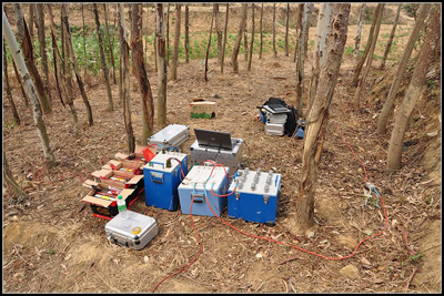 在测量过程中,中央电视台焦点访谈栏目组进行了跟踪采访。12点左右完成了测量。该地点环境噪声比较大,主要存在工频谐波干扰,从结果上看在该点存在大量的地下水,而且为非构造水,井位确定容易,在测量线圈内即可。之后在芳华镇大吉冲村沙哑沟完成第二测点测量。测点现场如下图。
