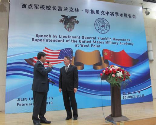 下午,西点军校校长哈根贝克中将在东荣大厦多功能厅以西点军校学生领导力的培养和素质教育为主要内容作专题学术报告,展涛主持了报告会。校部机关各部门负责人、部分学院院长和来自各学院的250多名师生参加了报告会。哈根贝克校长的报告反应热烈,听众先后提出许多问题,哈根贝克校长进行了认真回答,报告会在热烈友好的气氛中结束。