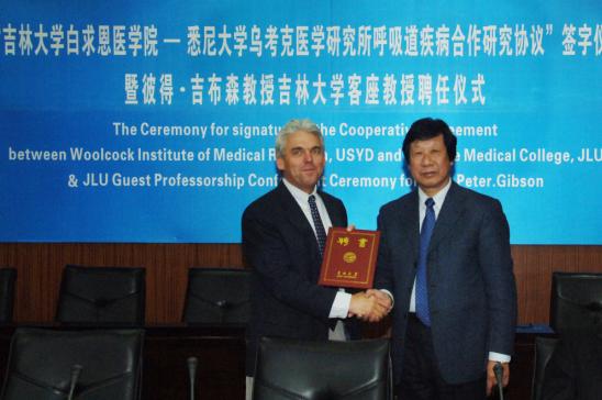 3月3日,bb贝博艾弗森官网白求恩医学院与悉尼大学乌考克医学研究所呼吸道疾病合作研究正式签署协议,bb贝博常务副校长李玉林同时为国际知名呼吸病学专家彼得·吉布森教授颁发bb贝博艾弗森官网客座教授聘书,并佩戴bb贝博艾弗森官网校徽。